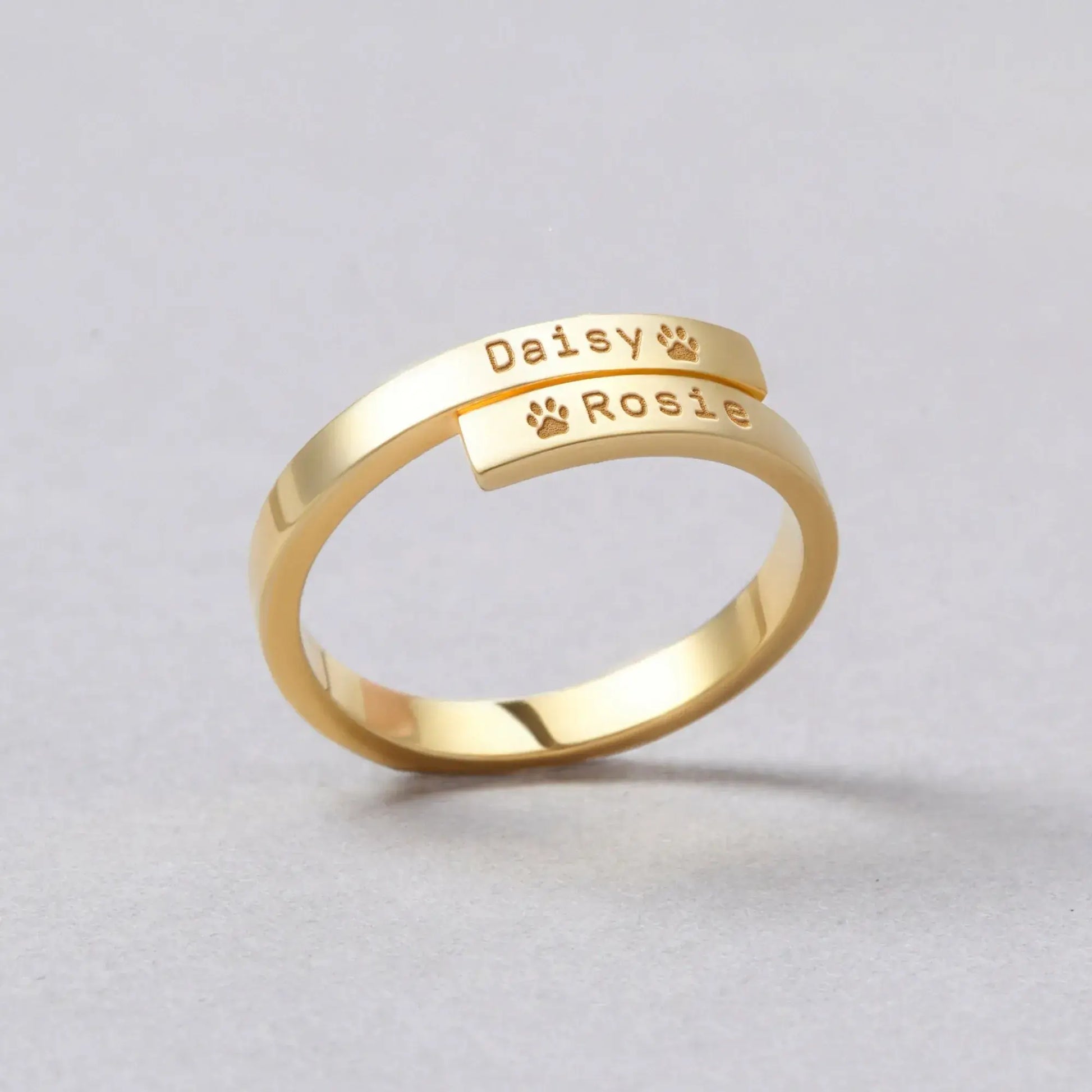 Lleva a tus mascotas contigo a todas partes. Nuestro Anillo con Nombre de Mascota está grabado con sus nombres y una pequeña huella de pata.